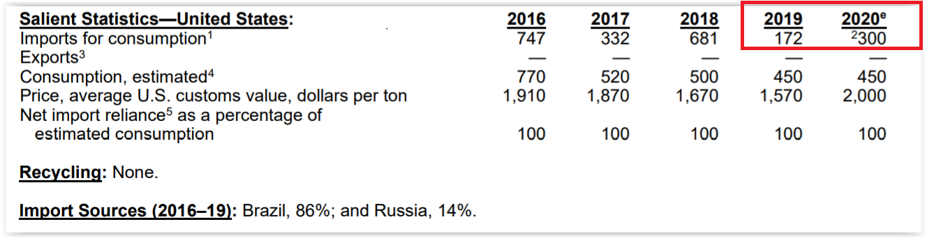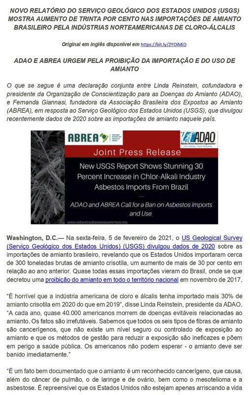 No final de janeiro de 2021, o Serviço Geológico dos Estados Unidos (USGS, sigla em inglês) divulgou um relatório com dados de 2020 sobre as importações de amianto pelos americanos.